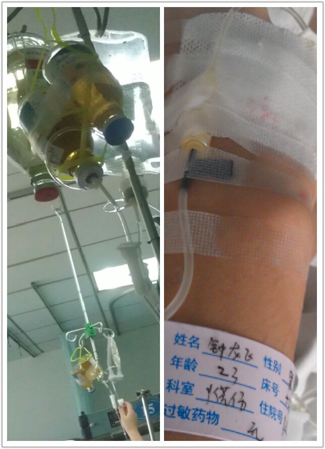 每天都输这么多的液体,几乎每个1小时就得上个厕所。我算了一下,每天可能都要输进去至少2升的水、、在医院的时候很多病友都调侃说,咱们输的全是五粮液!是啊,好贵啊、、、每天输液的费用就是两、三千吧~把我手都给输肿了,呜呜~~~~(>_<)~~~~
